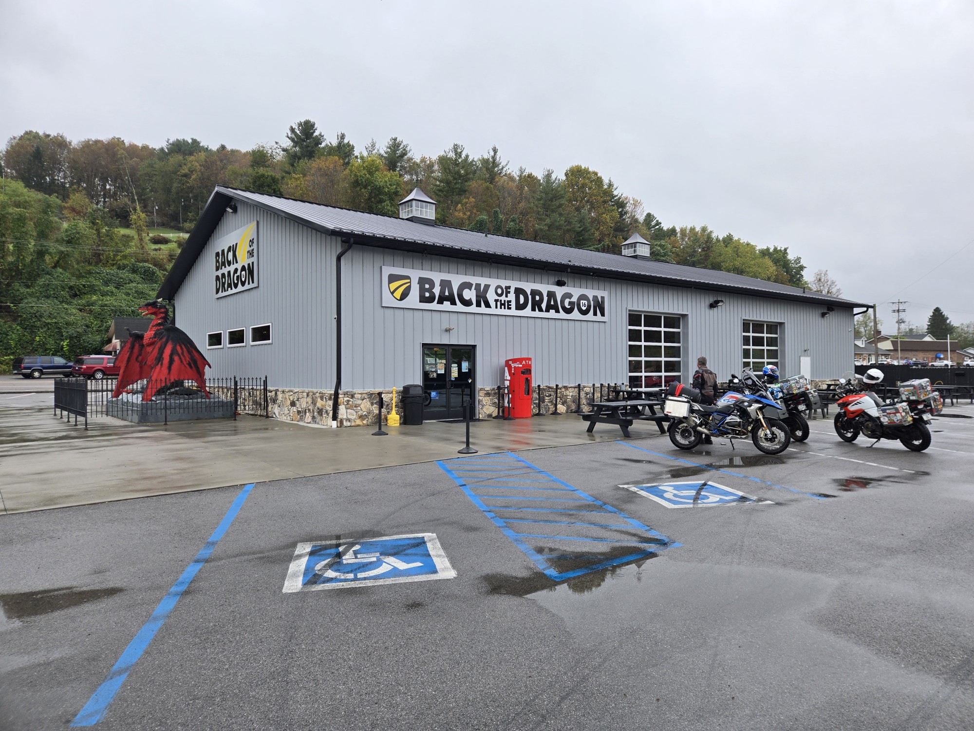 At 0940, we left our cabin in VA just as a rain cell hit. Prior darkening skies enticed us all to put on rain gear. As we rode the few miles down Rt58 to Rt16 the rain steadily increased. The road curved up and over mountains. Vision obstruction from rain, wet roads, and leaf litter on the roads made us ride more cautiously. Near coal loading yards, coal powder coveted the road. Some dips nearby had pooled dark water, that we avoided riding through.